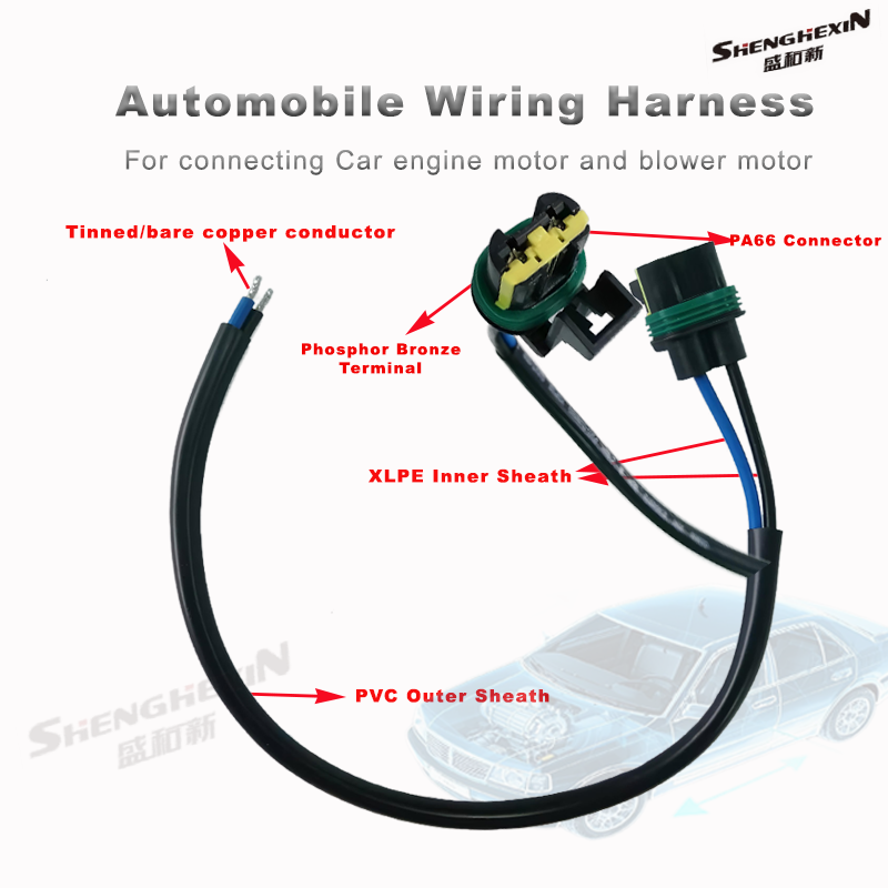 这辆汽车线束组件 旨在连接发动机电机&增压器电机,导线的导体是镀锡或裸铜制成的,这提供了出色的电气导电性,带有双层保护鞘,内层XL PE护套,外层PVC护套,可以耐受105摄氏度。
