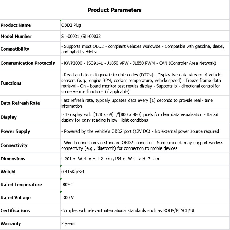 • OBD2插头是第二代车载诊断II插头,是车载电脑与外界通信的标准接口。它不仅用于汽车故障诊断,还可以连接各种外部电子设备,如行车记录仪、导航仪等,PVC外护套,额定温度80℃,额定电压300V,AWM:2464,24AWG耐腐蚀绝缘性能优异,耐候性好耐用,环保。