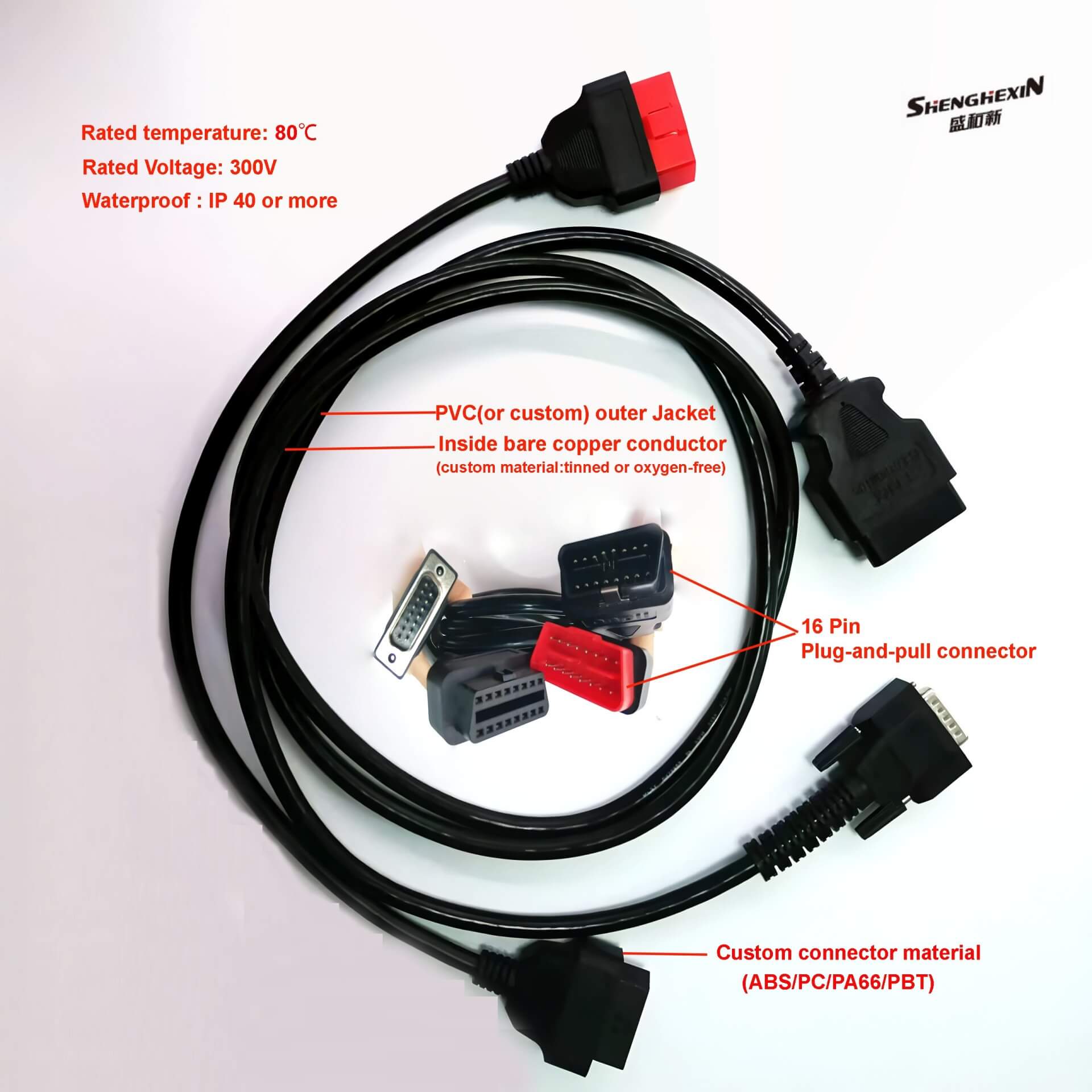 • OBD2插头是第二代车载诊断II插头,是车载电脑与外界通信的标准接口。它不仅用于汽车故障诊断,还可以连接各种外部电子设备,如行车记录仪、导航仪等,PVC外护套,额定温度80℃,额定电压300V,AWM:2464,24AWG耐腐蚀绝缘性能优异,耐候性好耐用,环保